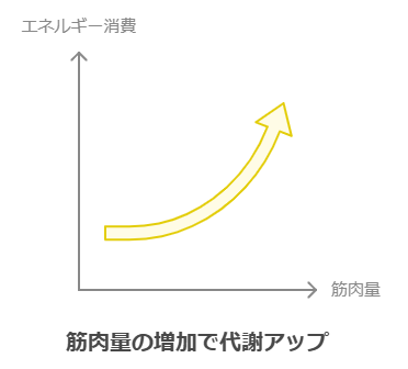 - 筋肉量の増加で代謝アップ 筋肉が増えると、代謝が上がり、リラックスしているときでもカロリーを燃焼しやすくなります。